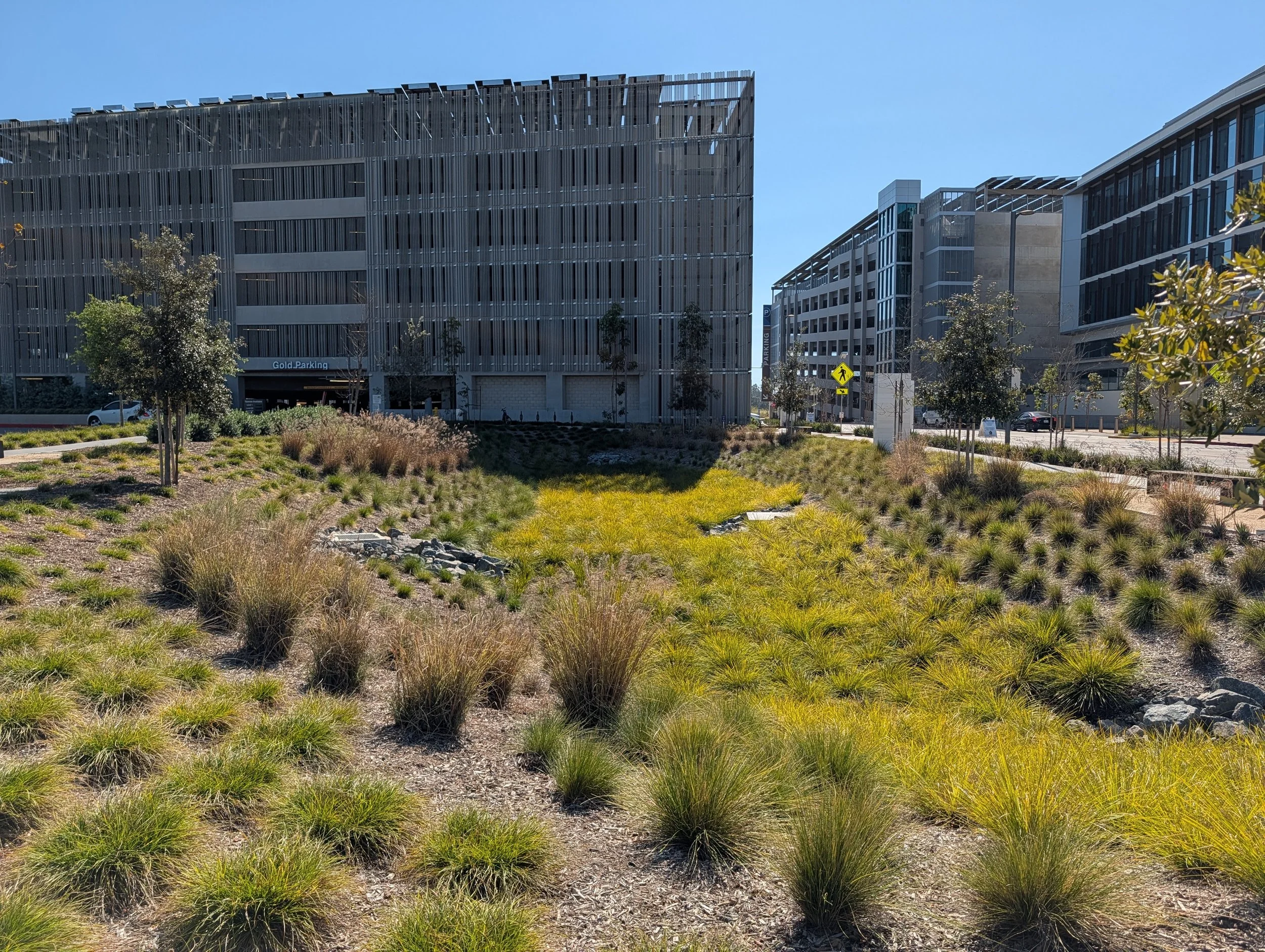UCI Medical Center is the first all electric medical facility in Orange County. Design-built project to deliver three buildings separated seismically with a 150,000 sf plaza on-structure, the project took cues from nature by pulling in the regional character of the San Joaquin Marsh Reserve System. Project also restored an engineered slope with native seed mix that transitions to the adjacent natural marsh.