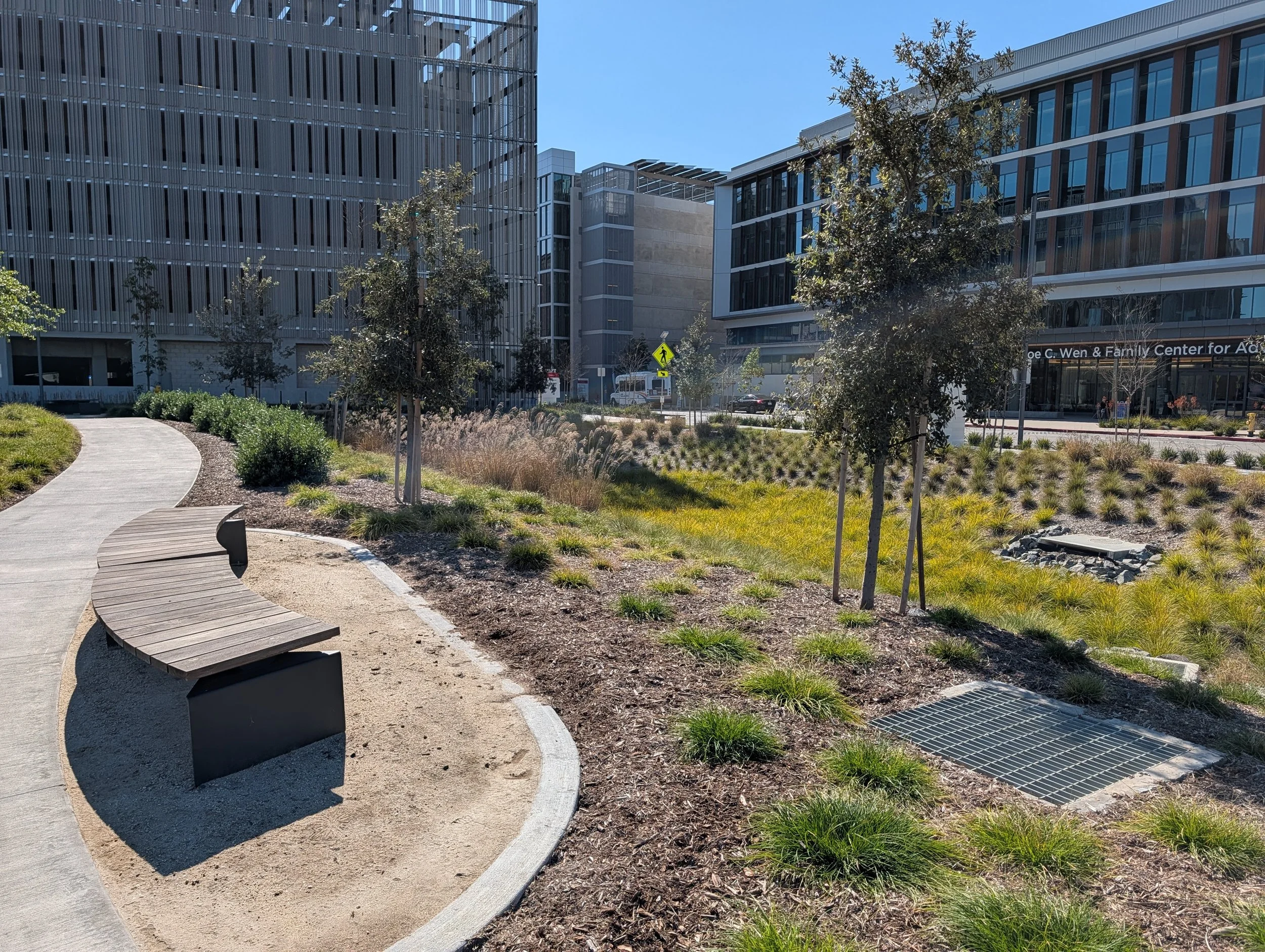 Good Samaritan’s seven story 190,000 sf expansion included a rooftop garden and bridge that connects to the existing campus. In order to treat the stormwater with limited exterior footprint, green infrastructure in the form of flow-through planters and biofiltration basins were implemented at every