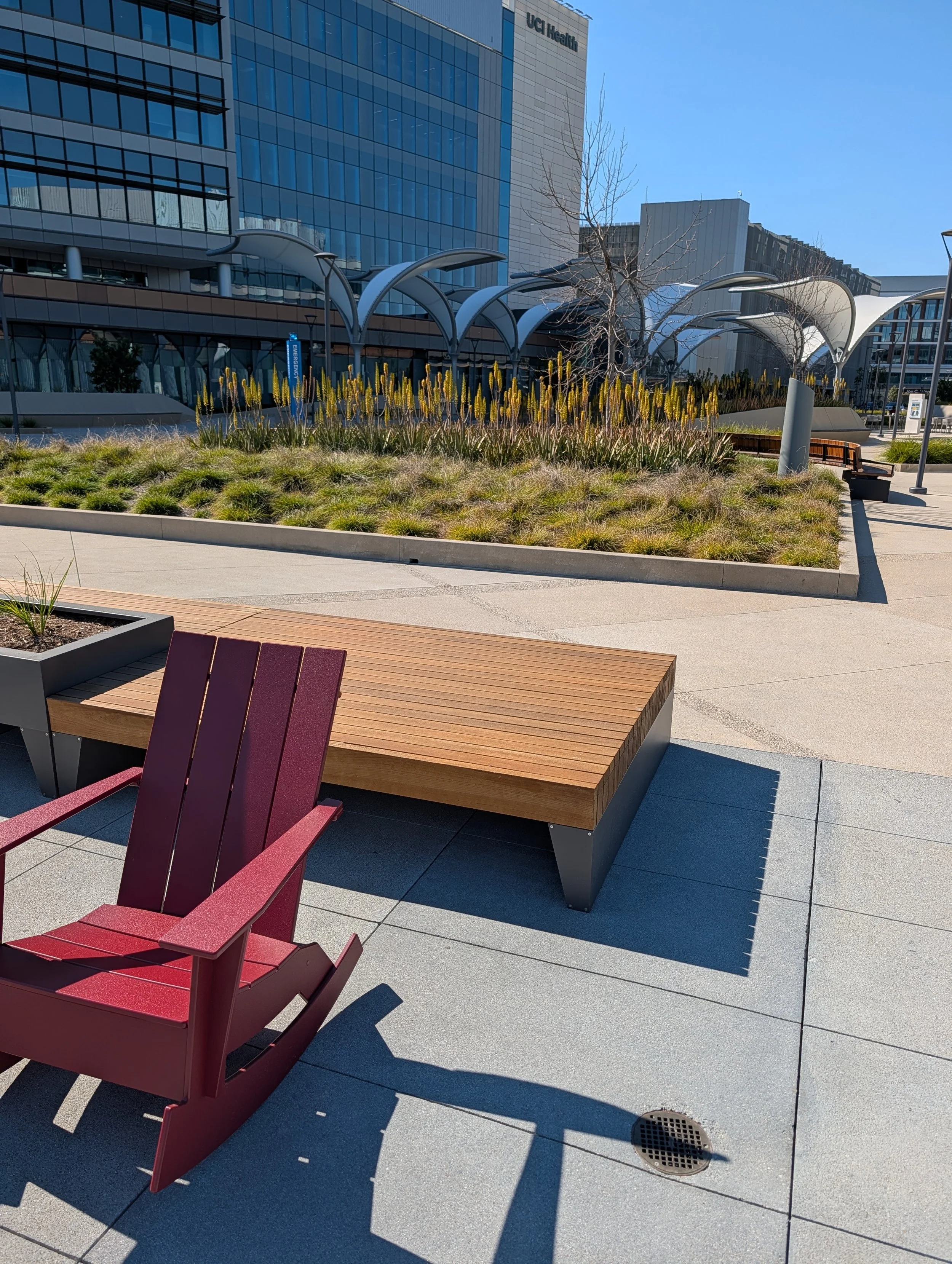 Medical office campus was infused with surf inspired sculptures and drift grasses. Custom seat benches with anti-skate notches complimented the clean lines of the plaza and entry approach. The parking garage façade at the street corner was broken up with greenscreens and vines.